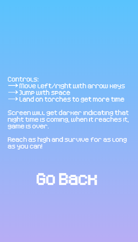 Torch leap is a vertical platformer about trying to survive for as long as possible before night time comes. Made for the "Micro Jam 046: Night" Game Jam.
